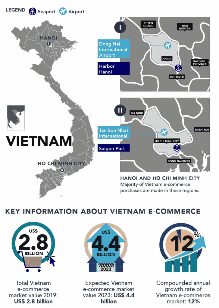 La majorité du E-Commerce vietnamien a lieu au sein des deux plus grandes régions métropolitaines du pays : Hanoi et Ho Chi Minh.