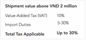 Le Vietnam applique une valeur minime d’envoi égale à 2 millions de VND. Si la valeur de vos envois est inférieure à cette valeur, vous ne serez pas facturé en droits et taxes. À l’inverse, si la valeur de vos envois est supérieure à 2 millions de VND, vous devrez payer les droits et taxes suivants :